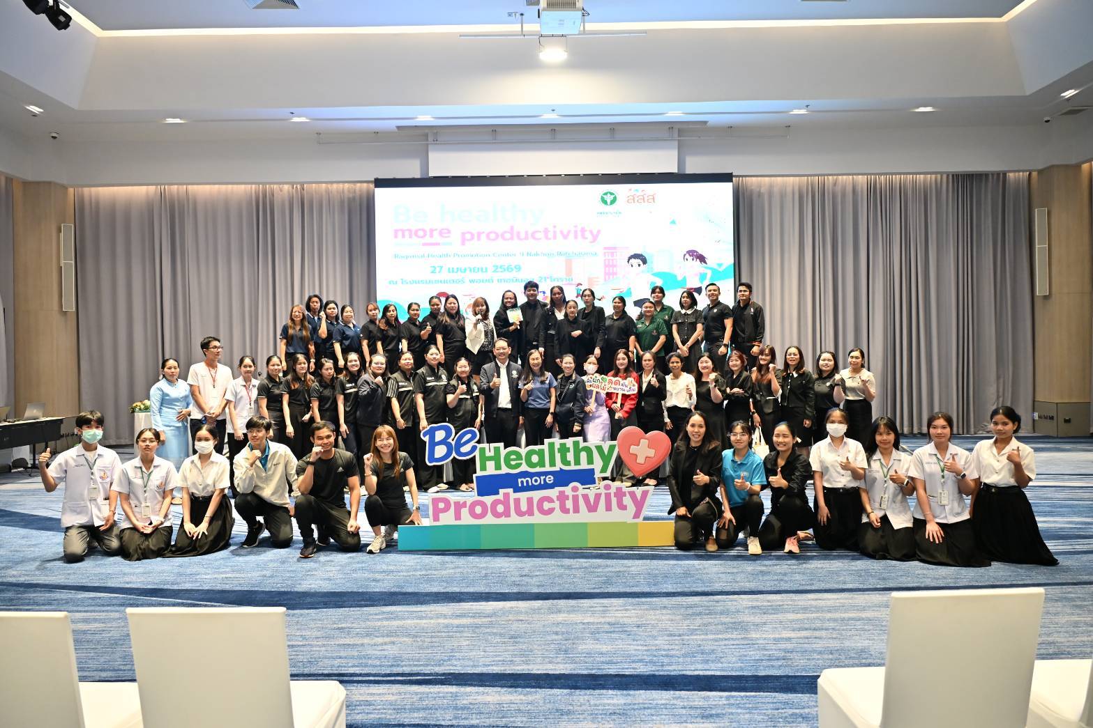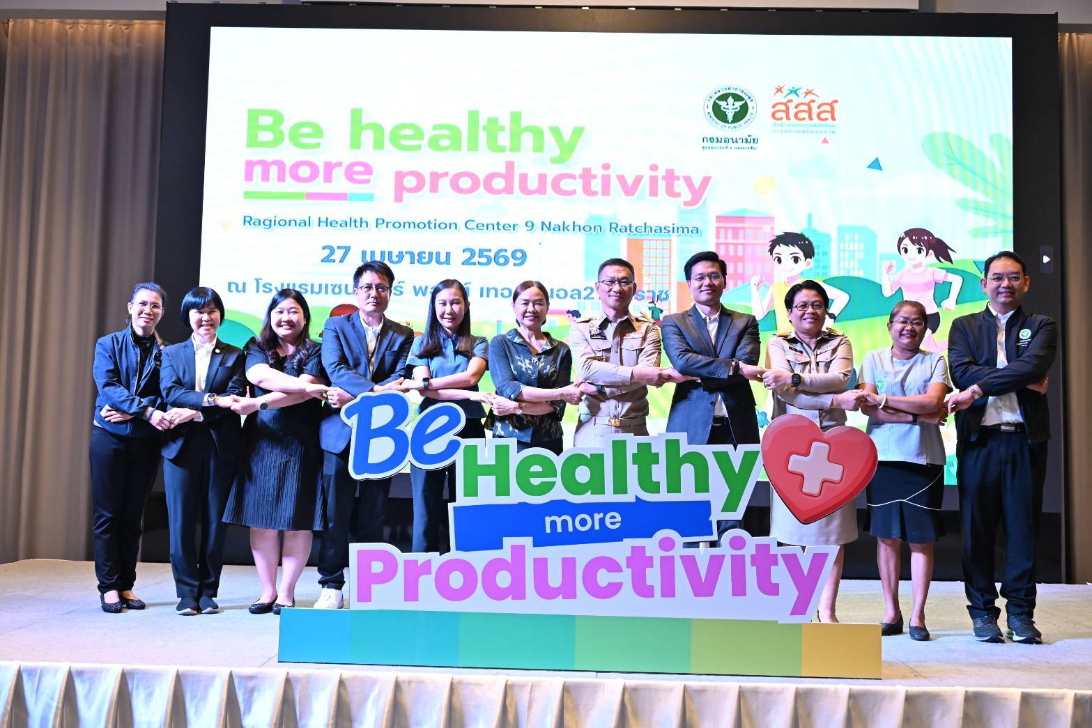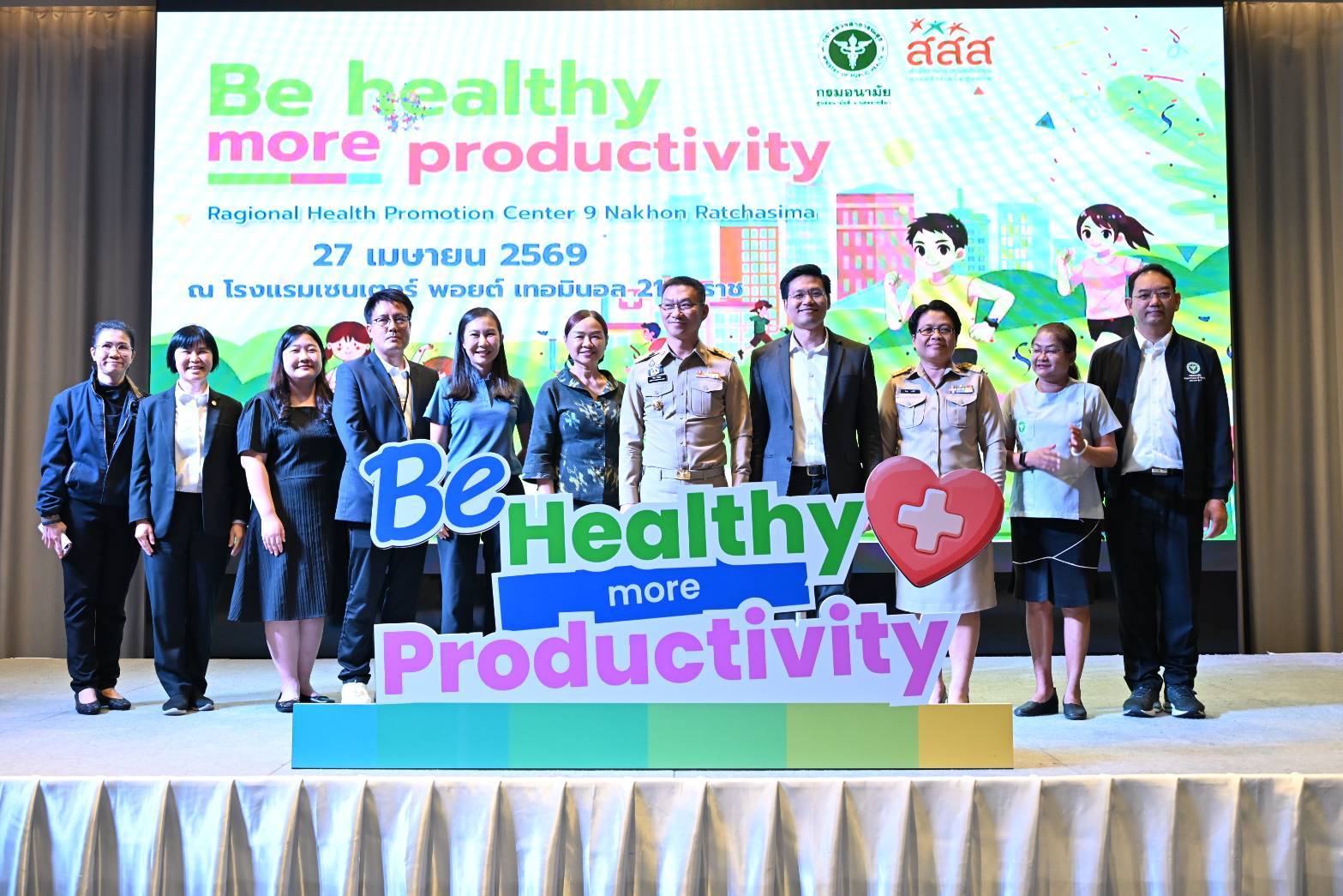 วันที่ 27 เมษายน 2569 ได้รับเกียรติ จาก นายวิจิตร กิจวิรัตน์ รองผู้ว่าราชการจังหวัดนครราชสีมา เป็นประธานเปิดงาน มหกรรมรณรงค์สร้างกระแส "Be Healthy More Productivity" โดยนายแพทย์พีระยุทธ สานุกูล ผู้อำนวยการศูนย์อนามัยที่ 9 นครราชสีมา มอบหมายให้ นายแพทย์นุกูล ปุ๋ยสูงเนิน รองผู้อำนวยการศูนย์อนามัยที่ 9 เป็นผู้แทนกล่าวรายงาน และกลุ่มพัฒนาการส่งเสริมสุขภาพวัยทำงาน จัดกิจกรรมรณรงค์สร้างกระแสการส่งเสริมสุขภาพเชิงรุกในสถานประกอบกิจการ ภายใต้แนวคิด “สุขภาพดี เพิ่มผลผลิต” (Be Healthy More Productivity) ณ โรงแรมเซนเตอร์ พอยต์ เทอมินอล 21 โคราช อำเภอเมืองนครราชสีมา จังหวัดนครราชสีมา วัตถุประสงค์เพื่อการรณรงค์สร้างกระแส "Be Healthy More Productivity": รวมพลังขับเคลื่อนองค์กรสุขภาวะ เพื่อแรงงานสุขภาพดี ผลิตภาพยั่งยืนโดยการส่งเสริมสุขภาพในสถานประกอบกิจการถือเป็นภารกิจสำคัญที่ต้องอาศัยความร่วมมือจากทุกภาคส่วน และสนับสนุนให้คนทำงานขยับกายสร้างสุขภาพดี ซึ่งนำไปสู่ดัชนีมวลกายที่สมดุล และห่างไกลจากโรค NCDs "พนักงานสุขภาพดี คือหัวใจสำคัญของการเพิ่มผลผลิต"การจัดมหกรรมครั้งนี้ มีกิจกรรม การบรรยายความรู้ บูธนิทรรศการ และนำเต้นออกกำลังกาย Long Life Thai Fit ซึ่งได้รับความร่วมมือสนับสนุนบูธนิทรรศการ จากกลุ่มงานเวชศาสตร์วิถีชีวิต กลุ่มงานทันตกรรม กลุ่มพัฒนาการส่งเสริมสุขภาพวัยเรียนวัยรุ่น กลุ่มการประเมินผลกระทบด้านสุขภาพ กลุ่มสุขาภิบาลอาหารและน้ำ ของศูนย์อนามัยที่ 9 นครราชสีมา และหน่วยงานเครือข่าย ได้แก่ ศูนย์สุขภาพจิตที่ 9 สำนักงานป้องกันควบคุมโรคที่ 9 นครราชสีมา ศูนย์ส่งเสริมอุตสาหกรรมภาคที่ 6 โรงพยาบาลจิตเวชนครราชสีมาราชนครินทร์ ศูนย์ความปลอดภัยในการทำงานเขต 3ห้างหุ้นส่วนจำกัด สยามธิดาฟู้ดกรุ๊ป และบริษัท เจ.เอช.อุตสาหกรรม จำกัด ซึ่งการรณรงค์ครั้งนี้ได้รับความสนใจและความร่วมมือจากเครือข่ายเข้าร่วมกิจกรรม 80 หน่วยงานรวมกว่า 180 คน