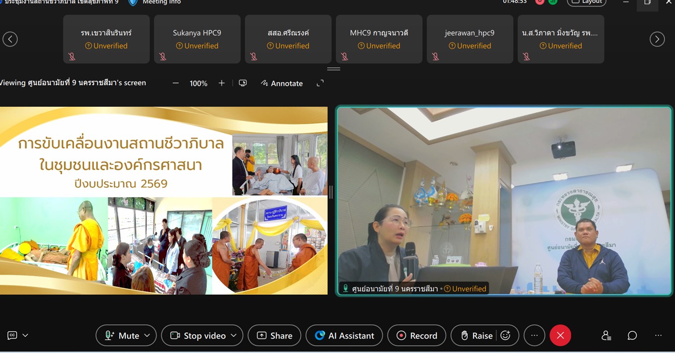 วันที่ 13 มกราคม 2569 นายแพทย์พีระยุทธ สานุกูล ผู้อำนวยการศูนย์อนามัยที่ 9 นครราชสีมา มอบหมายให้กลุ่มพัฒนาการส่งเสริมสุขภาพผู้สูงอายุ เข้าร่วมประชุมหารือแนวทางการดำเนินงานกรณีเสียชีวิตในสถานชีวาภิบาล ประจำปีงบประมาณ 2569 โดยได้รับเกียรติจาก นายแพทย์อุดมโชค อินทรโชติ ประธานคณะกรรมการระบบบริการสุขภาพ Service Plan สาขาชีวาภิบาล เขตสุขภาพที่9 เป็นประธานครั้งนี้ กลุ่มเป้าหมายได้แก่ ผู้รับผิดชอบงานสถานชีวาภิบาลจากภาคีเครือข่ายที่เกี่ยวข้อง และคณะกรรมการประเมินสถานชีวาภิบาลในชุมชนและองค์กรศาสนา เขตสุขภาพที่ 9 จำนวนกว่า 40 คน ณ ห้องประชุมมิตรภาพ ชั้น1 ศูนย์อนามัยที่9 นครราชสีมา และผ่านระบบการประชุมทางไกล (Webex meeting) ซึ่งสาระสำคัญของการประชุม ประกอบด้วย การนำเสนอภาพรวมผลการดำเนินงาน นโยบาย และแนวทางการพัฒนาระบบบริการสุขภาพ Service Plan สาขาชีวาภิบาล เขตสุขภาพที่ 9, ทบทวนการจัดทำคำสั่งคณะกรรมการประเมินสถานชีวาภิบาลฯ ประจำปีงบประมาณ 2569 รวมทั้งเปิดโอกาสให้มีการแลกเปลี่ยนข้อมูล ปัญหา-อุปสรรค ข้อเสนอแนะ ในแต่ละพื้นที่เพื่อเป็นโอกาสในการพัฒนางานสถานชีวาภิบาลเขตสุขภาพที่9 ให้มีประสิทธิภาพต่อไป