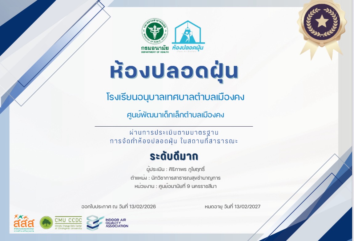 วันที่ 13 กุมภาพันธ์ 2569 นายแพทย์พีระยุทธ สานุกูล ผู้อำนวยการศูนย์อนามัยที่ 9 นครราชสีมา มอบหมายให้กลุ่มประเมินผลกระทบต่อสุขภาพ กลุ่มสุขาภิบาลอาหารและน้ำ ร่วมกับสำนักงานสาธารณสุขจังหวัดนครราชสีมา ลงพื้นที่ ประเมินห้องปลอดฝุ่น ณ ศูนย์พัฒนาเด็กเล็กตำบลเมืองคง โรงเรียนอนุบาลเทศบาลเมืองคง อำเภอเมืองคง จังหวัดนครราชสีมา การประเมินจะครอบคลุมในด้านบริหารจัดการ เช่น นโยบายหรือแนวทางการจัดทำห้องปลอดฝุ่น เจ้าหน้าที่ผู้รับผิดชอบ มาตรการต่างๆ การมีส่วนร่วมของชุมขน ด้านการดำเนินการ เช่น ภายในห้องไม่มีแหล่งก่อมลพิษ ปิดประตูหน้าต่าง มีเครื่องฟอกหรือเติมอากาศ เป็นต้น และด้านผลลัพธ์ ปริมาณฝุ่นภายในห้อง น้อยกว่า 25.0 มคก./ลบ.ม โดยผลการประเมินผ่านในระดับดีมาก