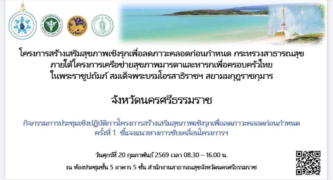 วันที่ 19–20 กุมภาพันธ์ 2569 ศูนย์อนามัยที่ 9 นครราชสีมา ร่วมกับสำนักส่งเสริมสุขภาพ กรมอนามัย ลงพื้นที่เพื่อเยี่ยมเสริมพลัง นิเทศและกำกับติดตามการขับเคลื่อนโครงการสร้างเสริมสุขภาพเชิงรุกเพื่อลดภาวะคลอดก่อนกำหนดในพื้นที่จังหวัดนครศรีธรรมราช