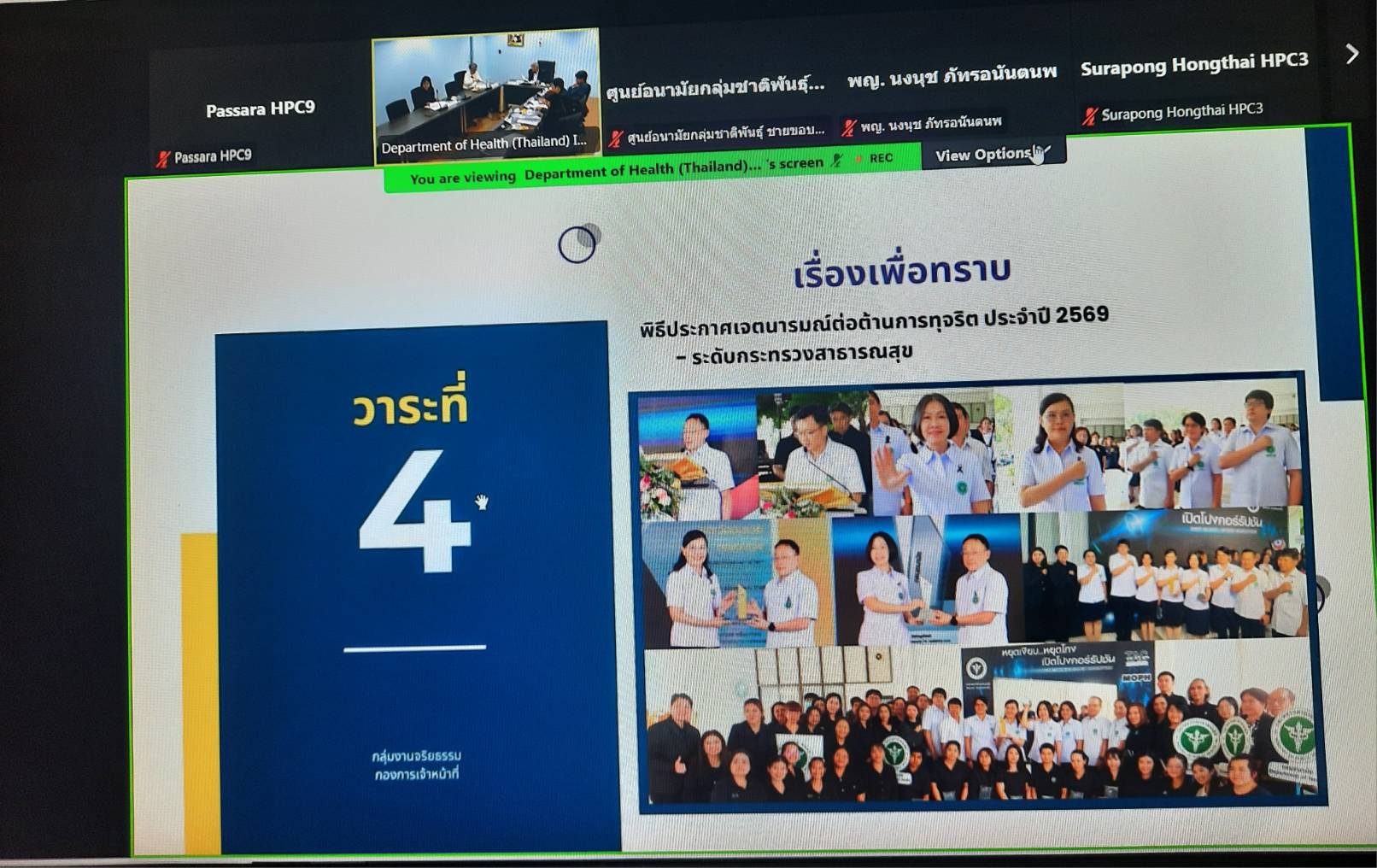 วันที่ 20 กุมภาพันธ์ 2569 นายแพทย์พีระยุทธ สานุกูล ผู้อำนวยการศูนย์อนามัยที่9 นครราชสีมา มอบหมาย ชมรมจริยธรรมศูนย์อนามัยที่9 เข้าร่วมประชุมคณะกรรมการจริยธรรมประจำกรมอนามัย ครั้งที่ 2/2569 ผ่านสื่ออิเล็กทรอนิกส์ เนื้อหาการประชุมประกอบด้วย แนวทางการดำเนินงานเรื่องร้องเรียนเกี่ยวกับการฝ่าฝืนประมวลจริยธรรมข้าราชการพลเรือน การไม่ปฏิบัติตามข้อกำหนดจริยธรรมเจ้าหน้าที่ของรัฐ กรมอนามัย พ.ศ.2568และการทุจริตและประพฤติมิชอบของเจ้าหน้าที่ กรมอนามัย(ฉบับปรับปรุงครั้งที่3) แผนปฏิบัติการส่งเสริมคุณธรรม จริยธรรมและป้องกันการทุจริตกรมอนามัย ประจำปีงบประมาณ 2569 รายงานเรื่องเรียนเกี่ยวกับคุณธรรม จริยธรรมและการทุจริต ประจำปี 2569 (ตุลาคม 2568-มกราคม 2569) รายงานผลการดำเนินงานตามแผนปฏิบัติการส่งเสริมคุณธรรม จริยธรรมและป้องกันการทุจริตกรมอนามัย ประจำปี 2569 กิจกรรมประกาศเจตนารมณ์ต่อต้านการทุจริต ปี 2569 และกิจกรรมการคัดเลือกคนดีศรีอนามัยและรางวัลเกียรติยศ กรมอนามัย ซึ่งจะจัดพิธีมอบในวันสถาปนากรมอนามัย 12มีนาคม 2569 การประชุมครั้งนี้เป็นการประชุมร่วมกับหน่วยงานกองการเจ้าหน้าที่ กรมอนามัยและหน่วยงานสังกัดกรมอนามัยในส่วนภูมิภาค จำนวน 54 คน จาก 30กว่าหน่วยงานซึ่งมีเป้าหมายขับเคลื่อนยกระดับองค์กรคุณธรรมและมีธรรมาภิบาลต่อไป