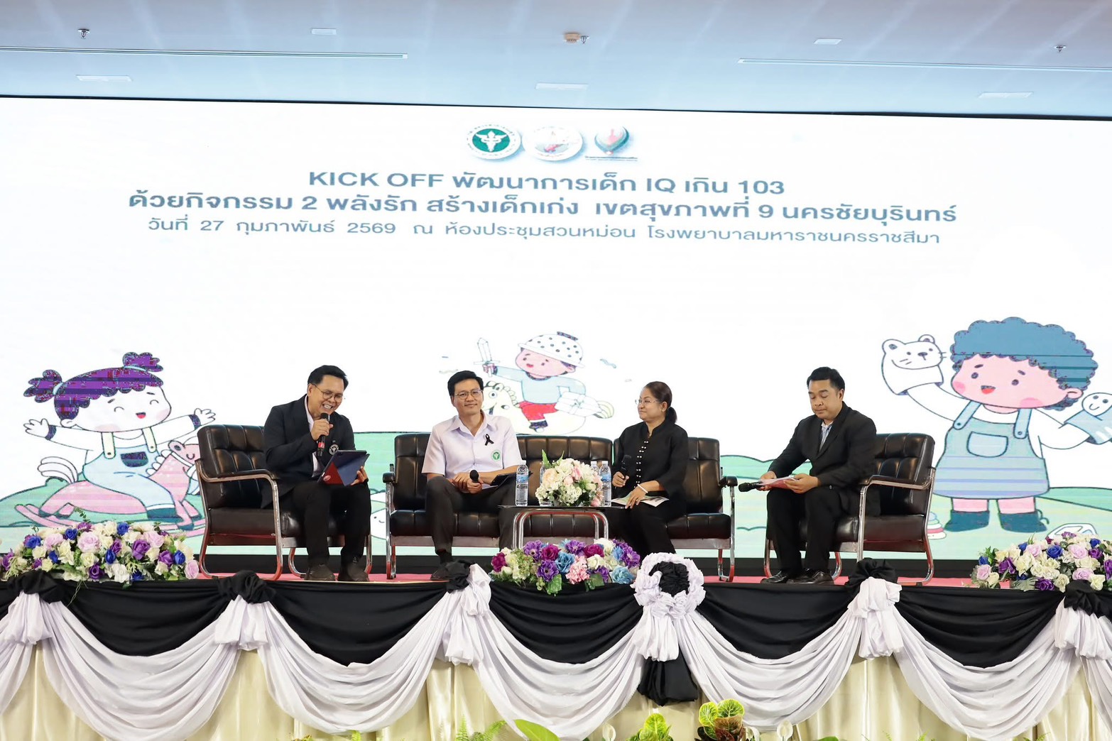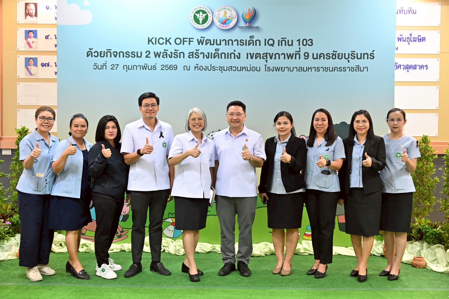 วันที่ 27 กุมภาพันธ์ 2569 นายแพทย์พีระยุทธ สานุกูล ผู้อำนวยการศูนย์อนามัยที่ 9 นครราชสีมา พร้อมด้วยนายแพทย์นุกูล ปุ๋ยสูงเนิน รองผู้อำนวยการศูนย์อนามัยที่ 9 นครราชสีมา นางชัชฎา ประจุดทะเก พยาบาลวิชาชำนาญการพิเศษ หัวหน้ากลุ่มพัฒนาอนามัยแม่และเด็ก เข้าร่วมเปิดโครงการส่งเสริมพัฒนาการเด็ก IQ เกิน 103 ด้วยกิจกรรม 2 พลังรัก สร้างเด็กเก่งเขตสุขภาพที่ 9 นครชัยบุรินทร์ ณ ห้องประชุมสวนหม่อน ชั้น7 อาคารผู้ป่วยนอกและอำนวยการ โรงพยาบาลมหาราชนครราชสีมา ทั้งนี้ท่านนายแพทย์นุกูล ปุ๋ยสูงเนิน รองผู้อำนวยการศูนย์อนามัยที่ 9 นครราชสีมา ได้ให้เกียรติเป็นวิทยากรอภิปรายกลุ่ม ในหัวข้อการส่งเสริมพัฒนาการเด็กนครชัยบุรินทร์ IQ เกิน 103 ด้วย 2 พลังรักสร้างเด็กเก่ง